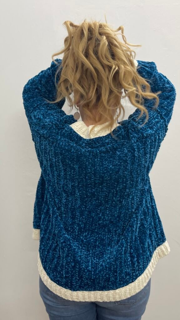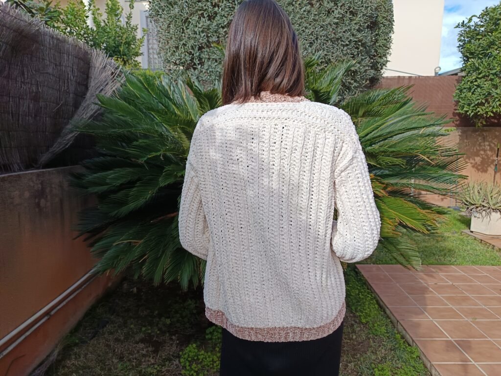 La textura principal se trabaja con punto medio alto en hebra trasera (BLO), creando un knit-look muy definido, elástico y moderno. Este tipo de textura imita visualmente el tejido a dos agujas, pero con la versatilidad del crochet.