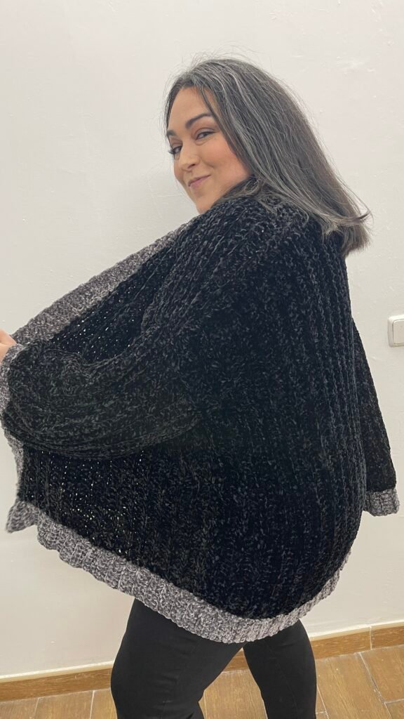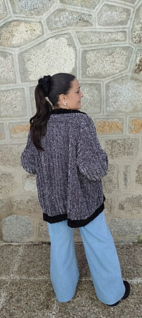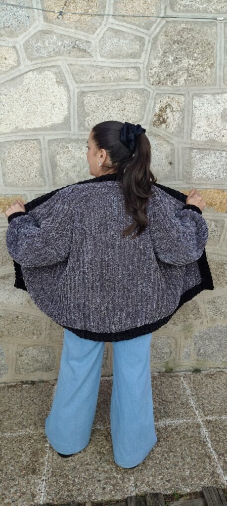 Es una estructura perfecta para cárdigans oversize a crochet, chaquetas largas y prendas con carácter.
