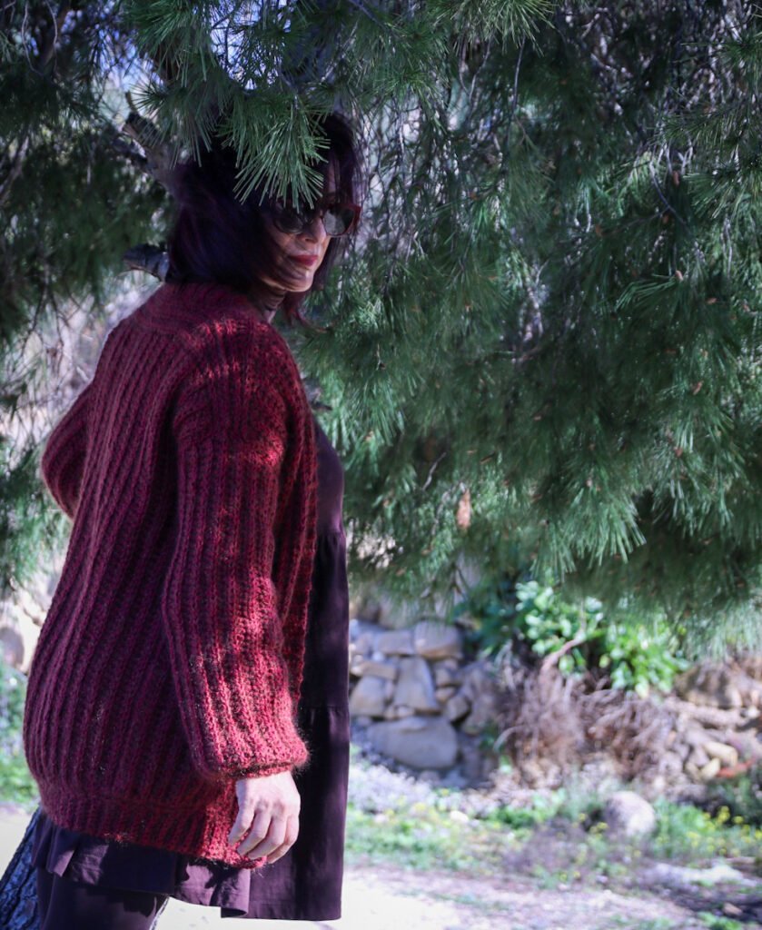 Tejido a doble hebra con Algodón Palomitas Casasol 200gr/320m color burdeos + Mohair Kid Silk Drops 25gr/215 m color chocolate. Cantidad utilizada en metros: Palomitas 990m y Mohair 925m