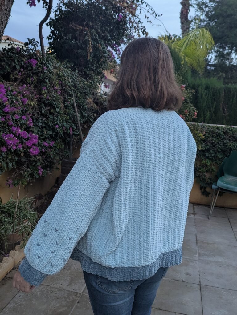 El Cárdigan Karkki es un cárdigan oversize a crochet con holgura positiva de 5 cm.