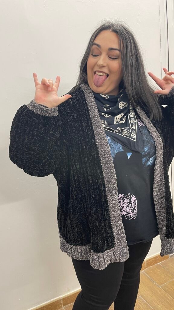 En finés, karkki significa chuche. Una palabra pequeña, dulce y cotidiana, pero cargada de emoción. Este cárdigan empezó a tomar forma mientras mi hija Alicia estaba en Finlandia, viviendo su propia aventura. Yo, desde aquí, tejía con esa mezcla de nostalgia, orgullo y calma que solo aparece cuando las manos se mueven solas sobre el hilo.