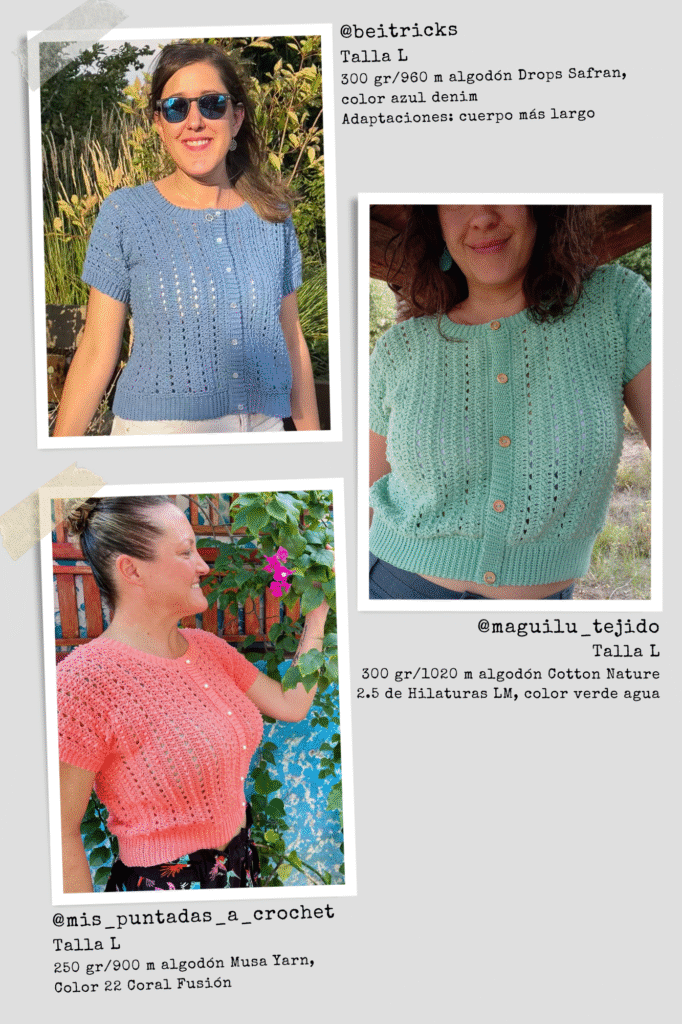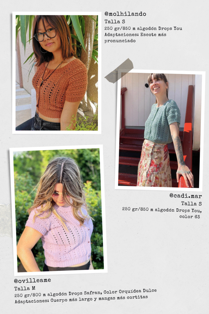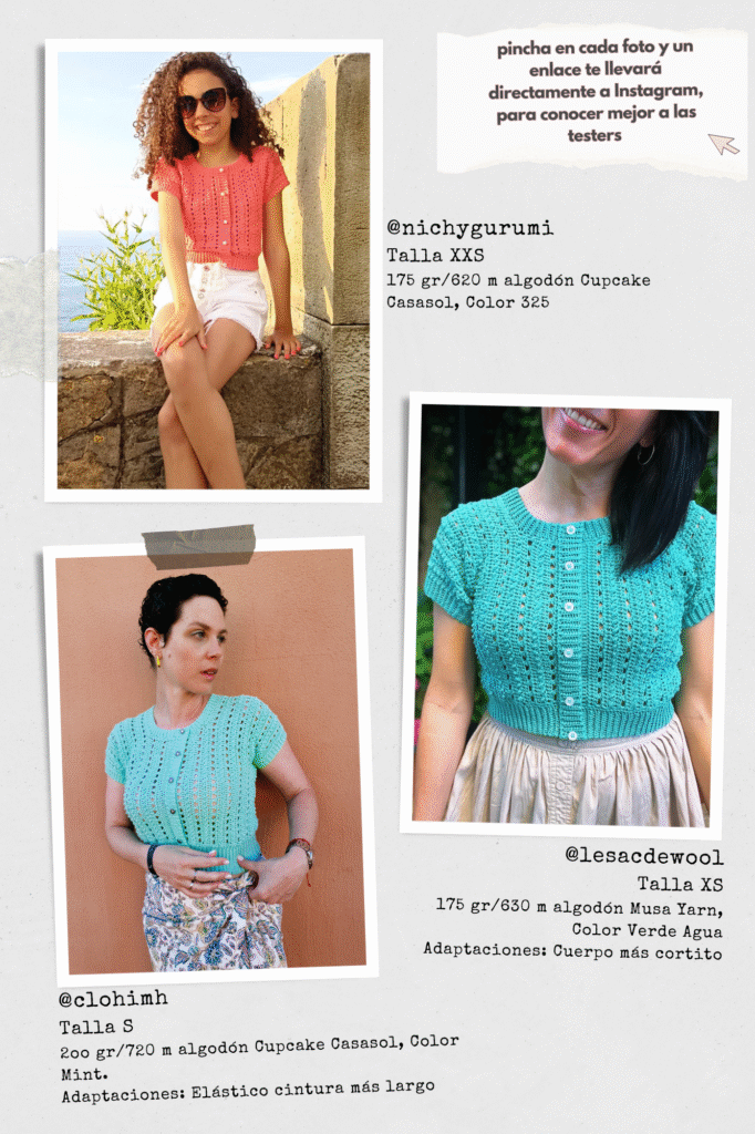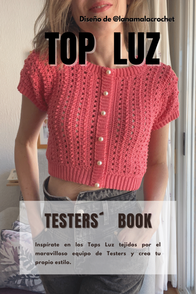 Una de las joyas de este patrón es el Testers’ Book, un documento fotográfico con todas las versiones del Top Luz tejidas por mi increíble equipo de testers. Verás fotos de diferentes versiones del top, adaptaciones personales como mangas más cortas, diferentes largos y escotes, cada una acompañada de la talla, el tipo de hilo y la cantidad utilizada. Esta galería te servirá como una fuente de inspiración para crear tu propia versión del Top Luz.
