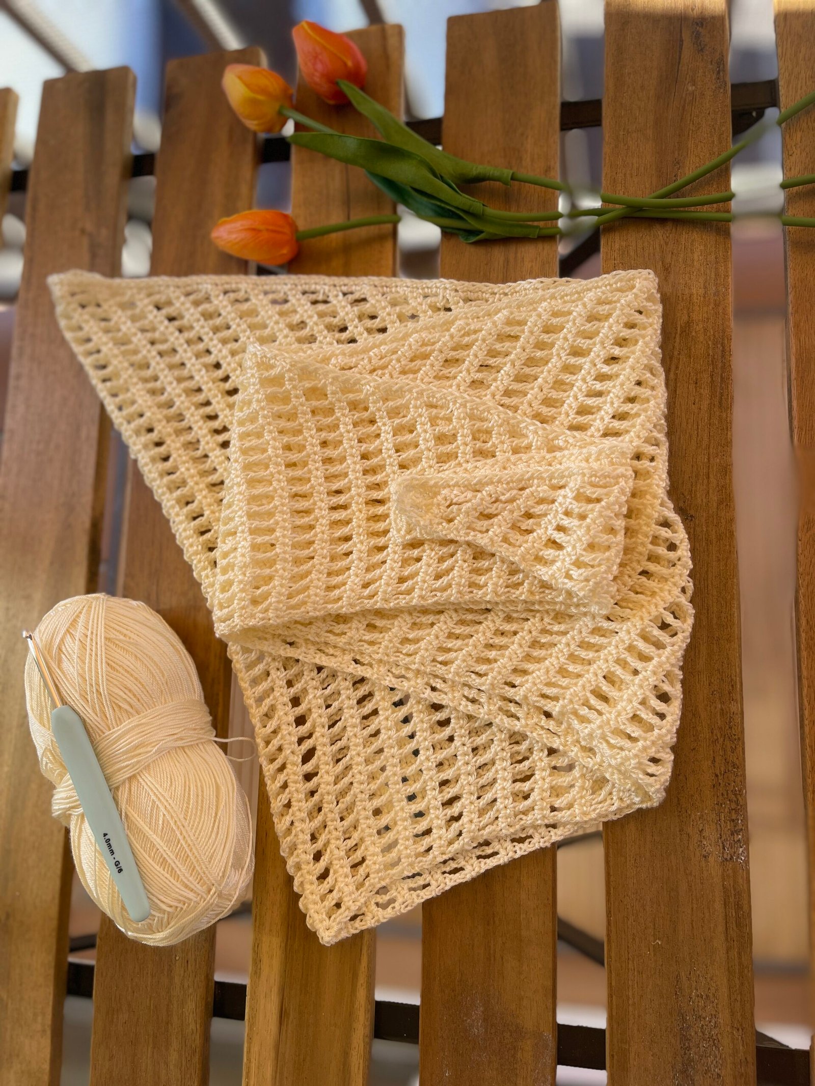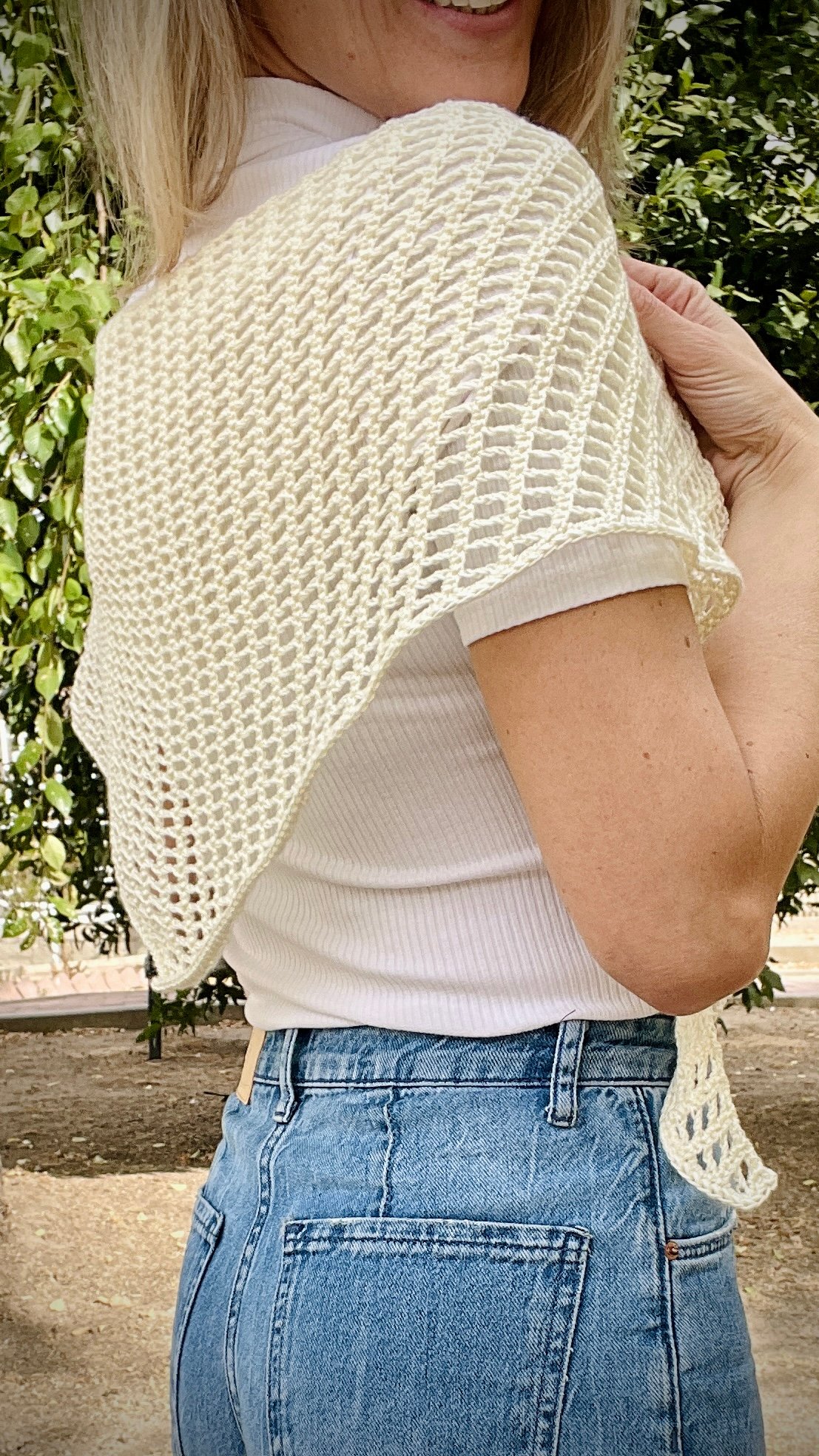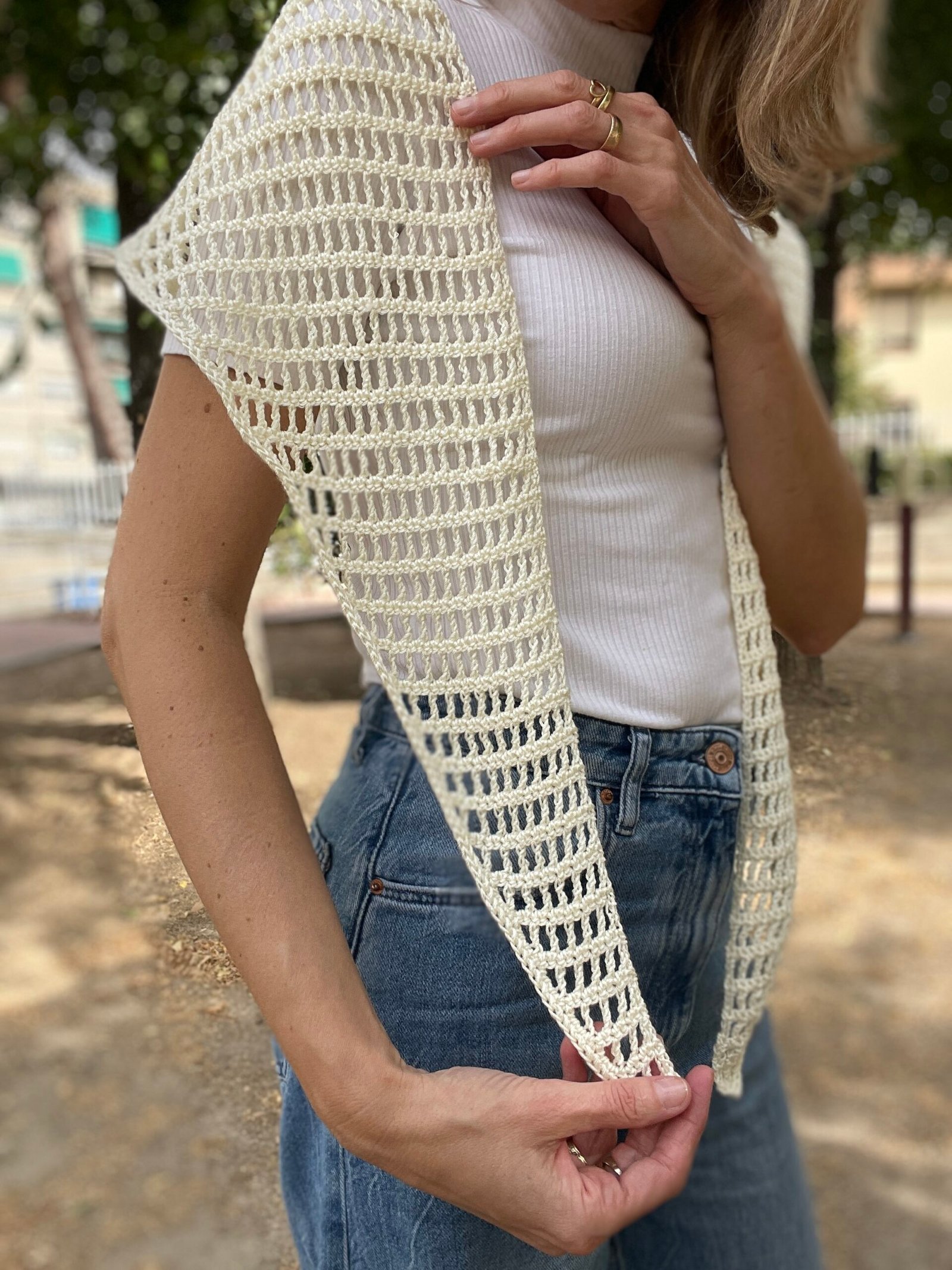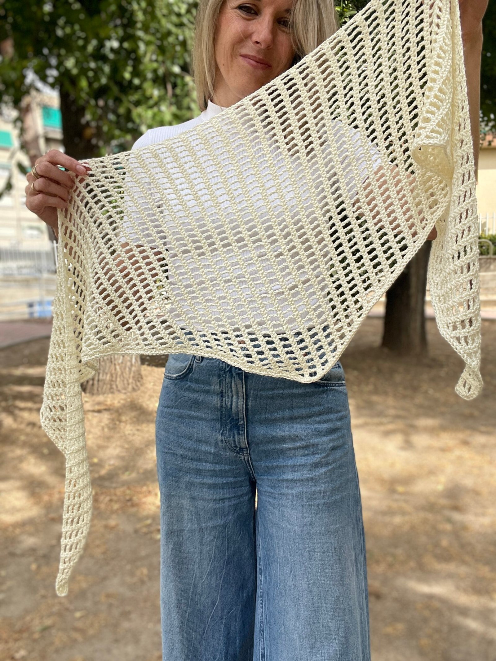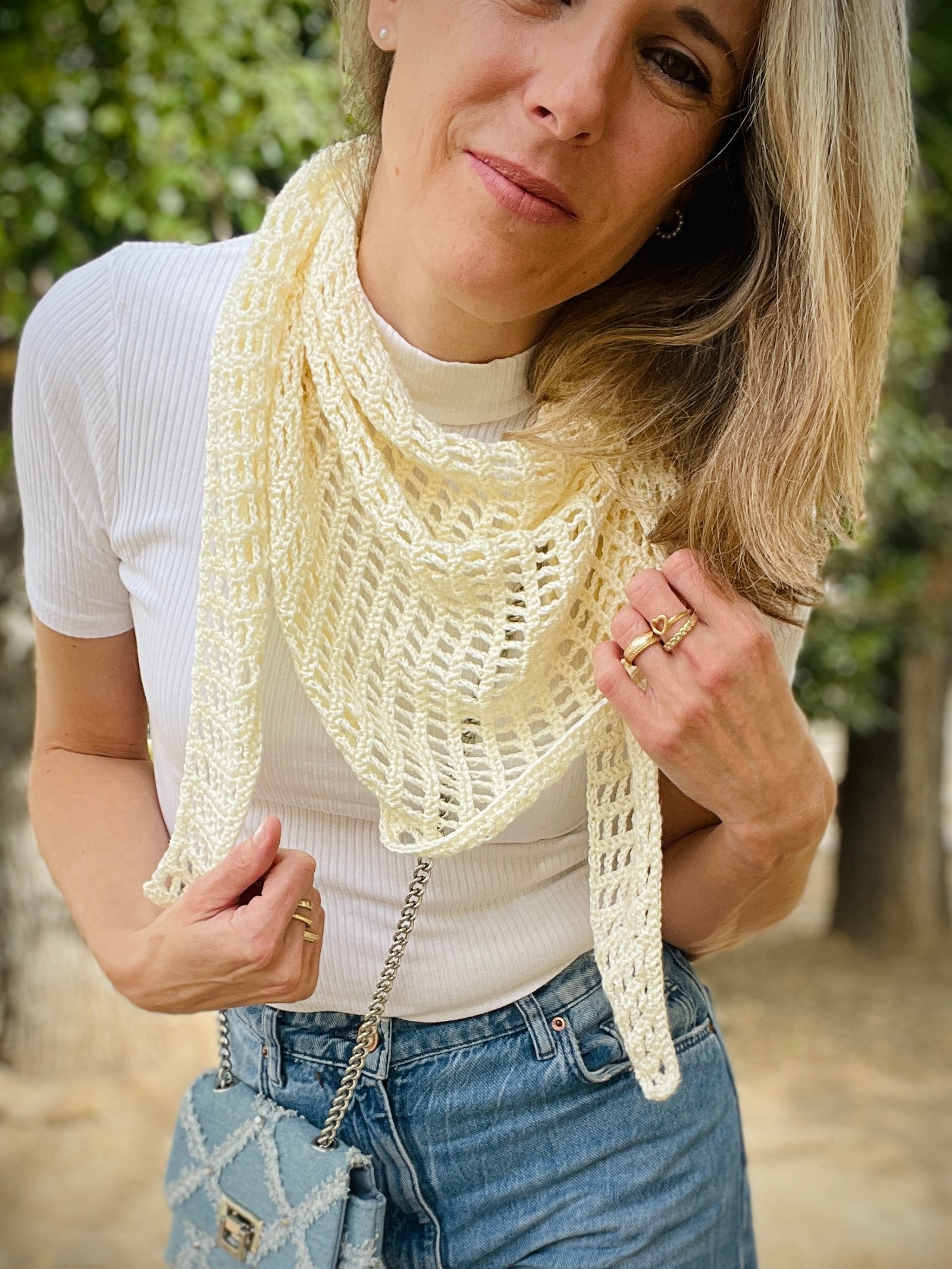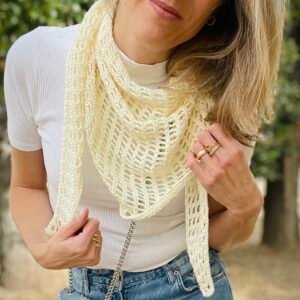 El Chal Bandana está tejido con un punto calado enrejado muy ligero, perfecto para el entretiempo, y podrás tenerlo listo en poco tiempo. Además, aprenderás la construcción del chal triangular a crochet, que te servirá como base para crear otros proyectos de ganchillo con la misma estructura.